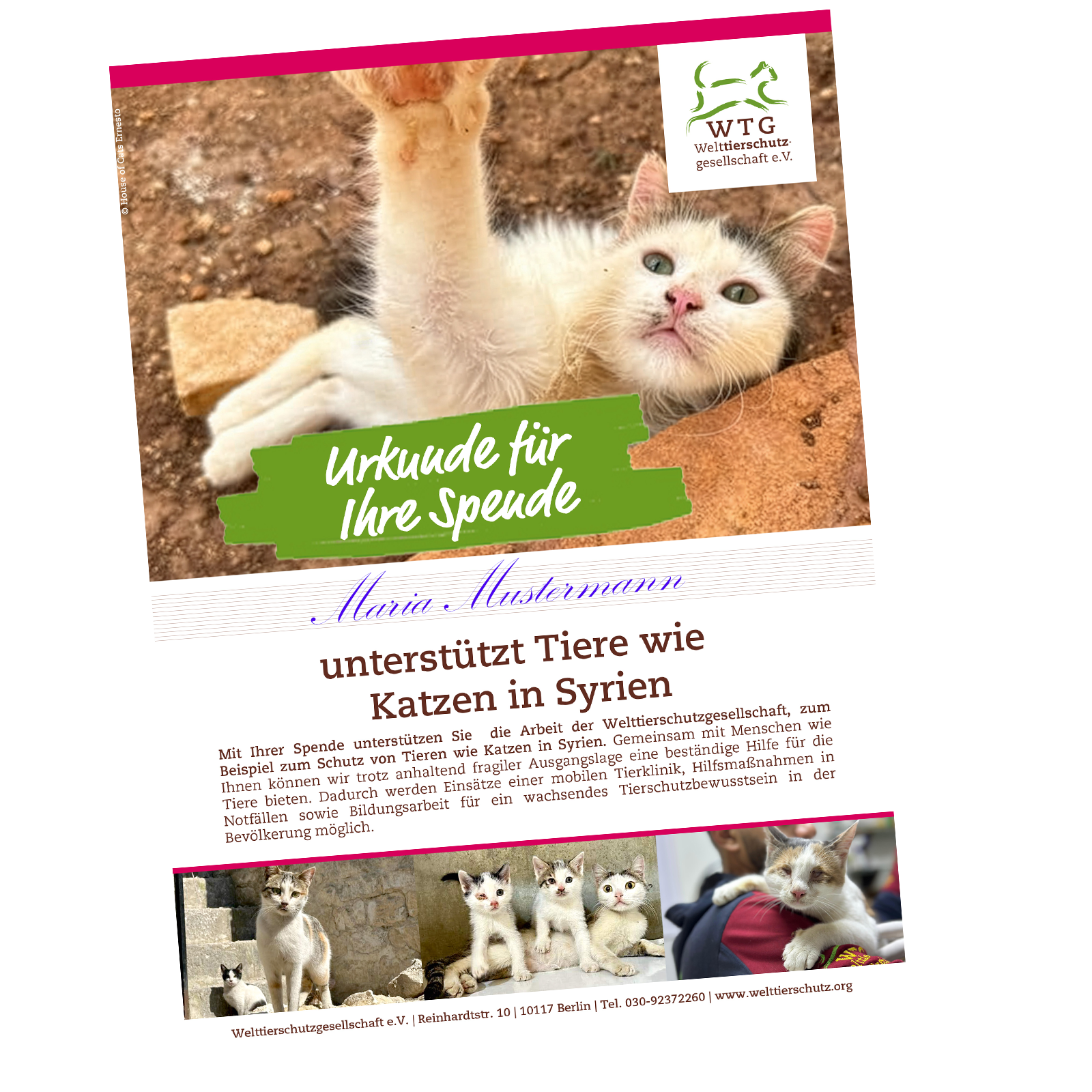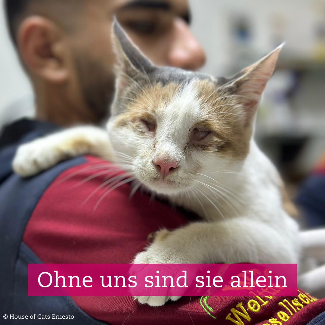 Es sind Katzen wie Aliya – eine von vermutlich Millionen Tieren in Syrien – die ohne unsere Hilfe keine Chance hätten. Seit fast zehn Jahren leisten wir gemeinsam mit unserer Partnerorganisation in der Region Idlib mit einer stationären Klinik und umfangreicher Bildungsarbeit in der Bevölkerung lebensrettende Tierschutzarbeit. Mit mobilen Einsätzen wollten wir alsbald auch in Städten wie Aleppo aktiver werden. Denn nur durch unseren im Land einzigartigen Einsatz können Tiere wie Aliya dringend notwendige Behandlung und lebensentscheidende Hilfe erhalten.